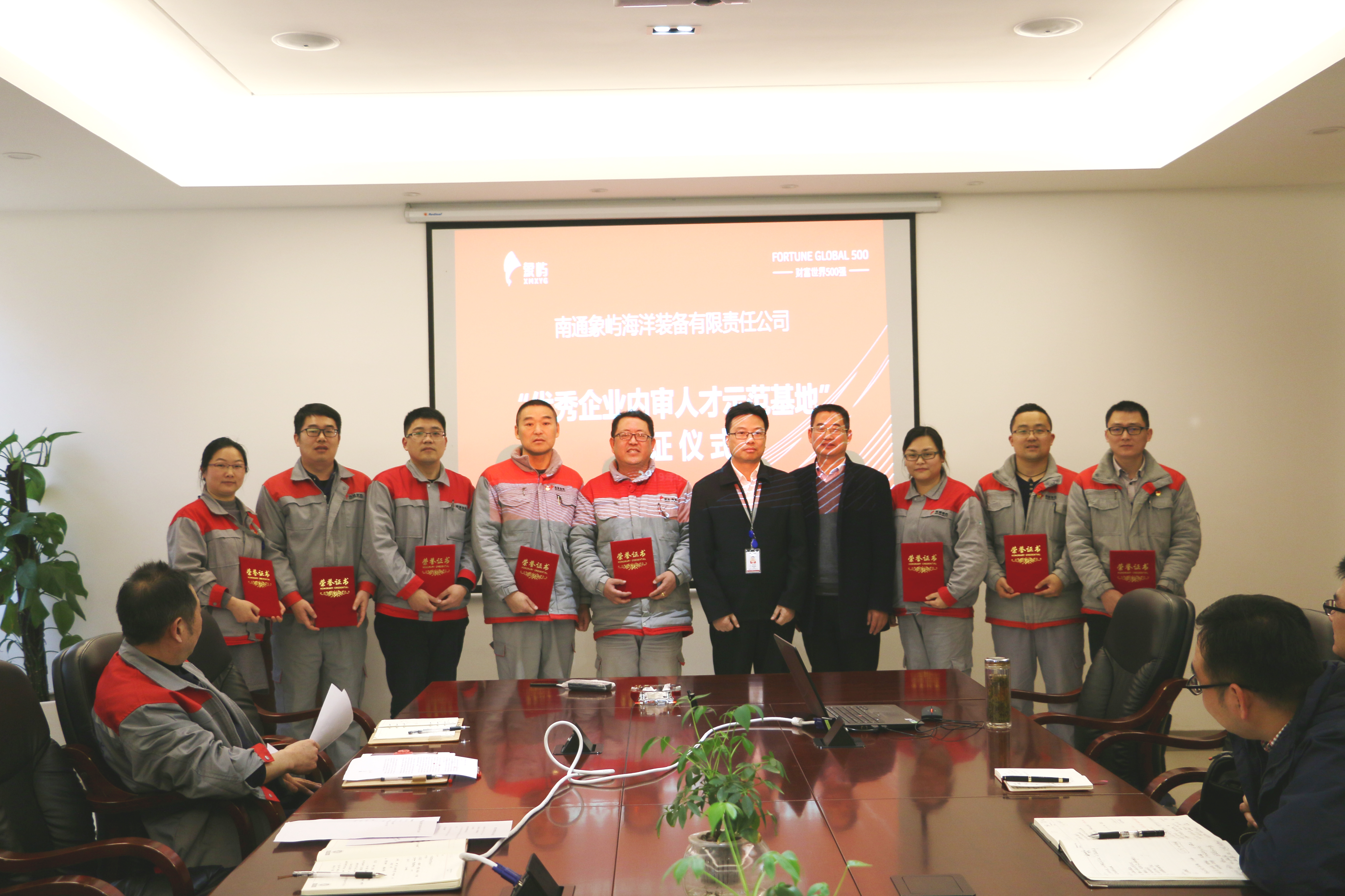 本次授牌儀式在象嶼海裝二樓會(huì)議室舉行,各部門負(fù)責(zé)人以及最新獲得內(nèi)審員資格證書的代表參加了該儀式。象嶼海裝常務(wù)副總秦偉民接受了CCS南京公司業(yè)務(wù)總監(jiān)王慶余頒發(fā)的“優(yōu)秀企業(yè)內(nèi)審人才示范基地”牌匾。