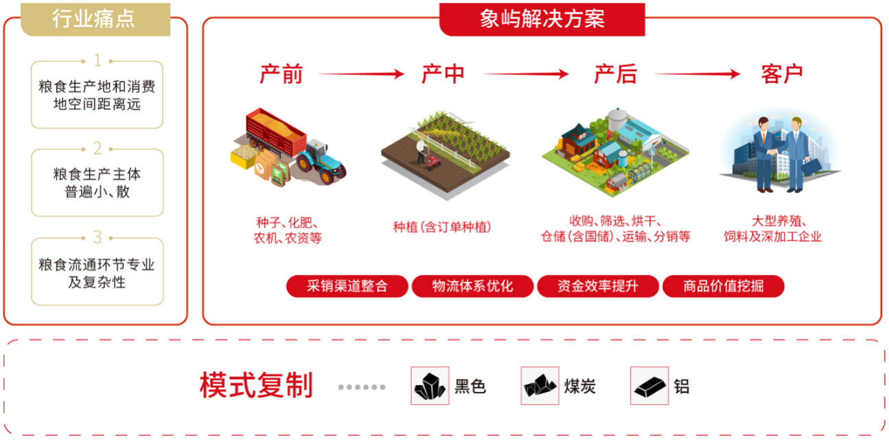 今年初,象嶼聯(lián)手阿里云結(jié)合東北農(nóng)業(yè)實(shí)際,攜手在糧食板塊先行先試建設(shè)農(nóng)業(yè)產(chǎn)業(yè)級互聯(lián)網(wǎng)平臺。該平臺將貫穿糧食產(chǎn)業(yè)鏈種植、倉儲、流通三大環(huán)節(jié),借助物聯(lián)網(wǎng)、云計算、區(qū)塊鏈?zhǔn)侄螌?shí)現(xiàn)輕資產(chǎn)模式下倉容快速擴(kuò)張,連接用糧方、金融、物流等生態(tài)方,提升全產(chǎn)業(yè)鏈貿(mào)易、物流與金融效率。 未來,象嶼農(nóng)產(chǎn)將做深“一條鏈”,做大“一個園”,形成共創(chuàng)共享共贏的全產(chǎn)業(yè)鏈資源生態(tài)系統(tǒng),圍繞“雙循環(huán)”發(fā)展格局,進(jìn)一步優(yōu)化投資結(jié)構(gòu),延伸投資鏈條,創(chuàng)新產(chǎn)業(yè)模式,為鄉(xiāng)村振興、促進(jìn)農(nóng)業(yè)高質(zhì)高效發(fā)展貢獻(xiàn)力量!